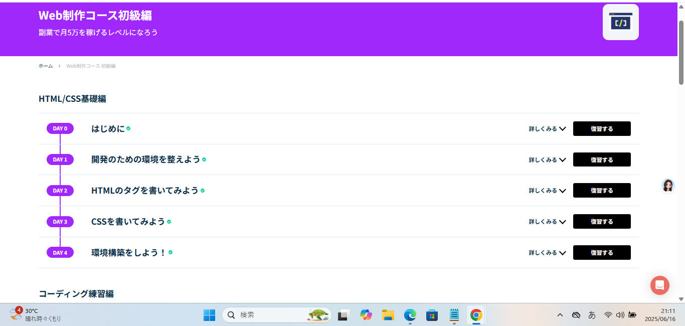 例えば、初級編のHTML/CSS基礎パートでは、以下のようにDAYごとにやることが決まっています👇